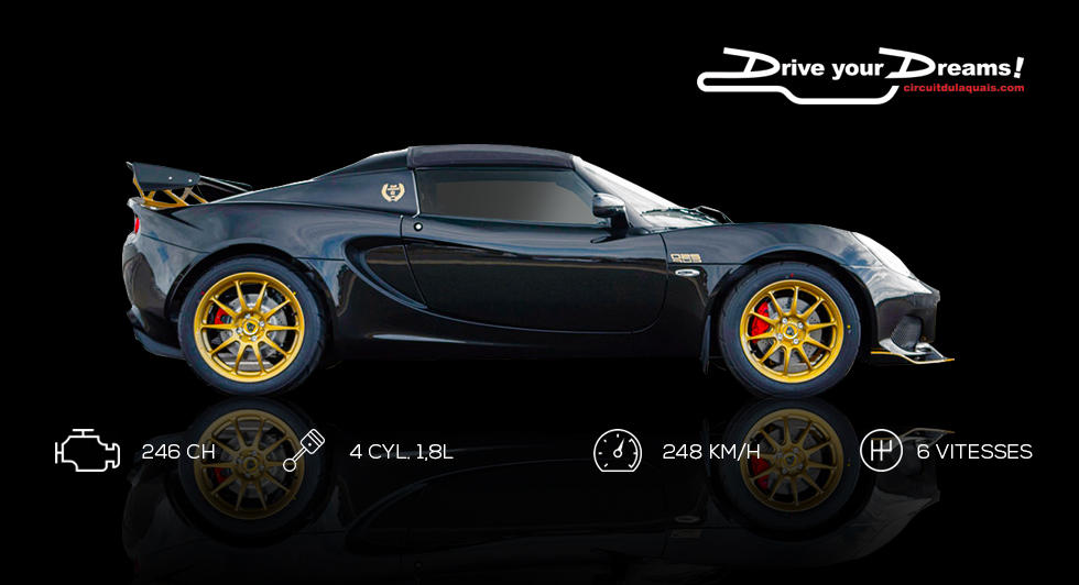 Cette édition limitée et ultralégère de la Lotus Elise 250 Cup GP, animée par un moteur 4 cylindres suralimenté de 246 chevaux et une boîte de vitesses mécanique à 6 rapports, est parfaite pour découvrir ou parfaire sa technique sur circuit automobile sans nécessairement prendre le volant d'une voiture de course. Un stage de pilotage d'une-demi journée en coaching personnalisé est idéal pour les pilotes débutants ou confirmés.